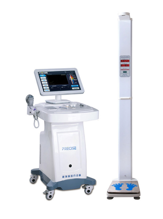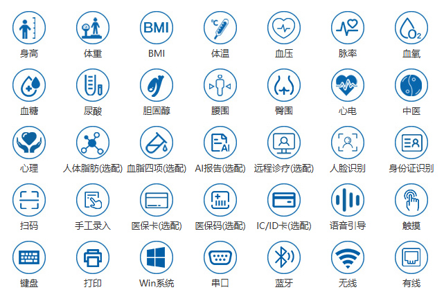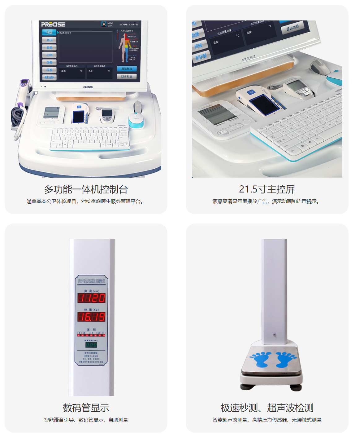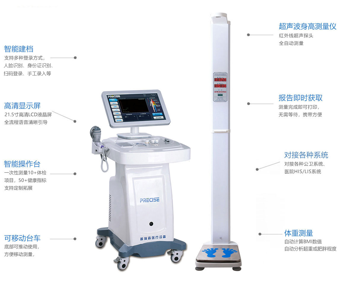 品牌名称:普瑞森 设备型号:PRS-1000A 规格尺寸:台车65×65×130cm 秤30×30×230cm 屏幕:21.5寸主控屏 标配功能:身高、体重、BMI、体温、血压、脉率、血氧、血糖、尿酸、胆固醇、腰围、臀围、心电、中医、心理。 拓展功能:人体脂肪、血脂四项、AI报告、远程诊疗。 登记方式:人脸识别、身份证识别、扫码、手工录入、(可拓展:医保卡、医保码、IC/ID卡)。 应用配置:语音引导、触摸、键盘、打印。 技术配置:Win系统、串口、蓝牙、无线、有线。 可对接:第三方平台对接、HIS、LIS、EMR、公卫平台、慢病平台、家医平台、API接口等。 适用场景