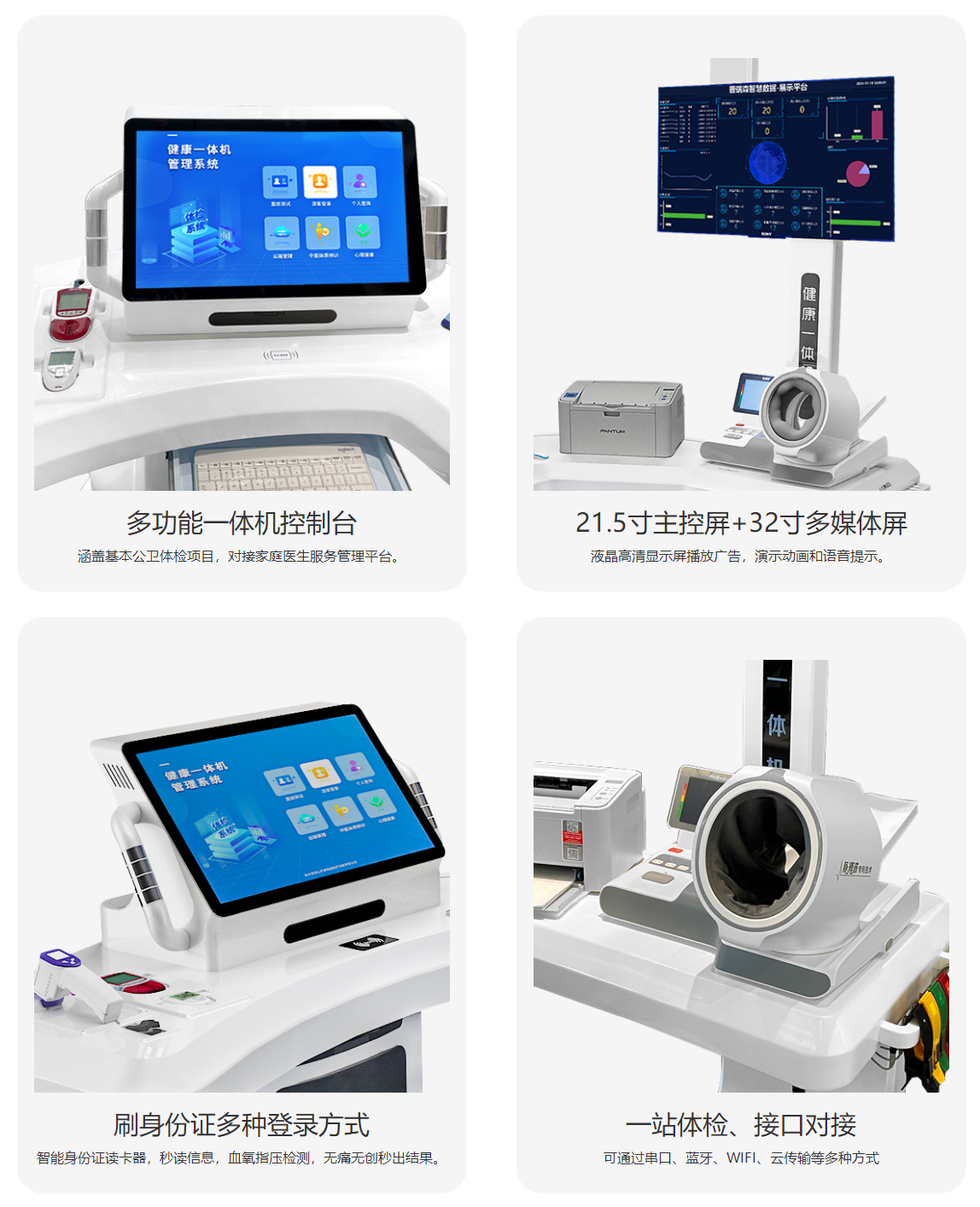 规格尺寸:160×140×230cm 屏幕尺寸:21.5寸主控屏、32寸多媒体屏标配功能:身高、体重、BMI、体温、血压、脉率、人体脂肪、血氧、血糖、尿酸、胆固醇、血脂四项、腰围、臀围、心电、视力、色盲、色弱、散光、中医、心理。 拓展功能:酒精、尿液分析、肺功能、骨密度、动脉硬化、精神压力、血红蛋白、AI报告、远程诊疗。 登记方式:人脸识别、身份证识别、扫码、手工录入、(可拓展:医保卡、医保码、IC/ID卡)。 应用配置:语音引导、触摸、键盘、打印。 技术配置:Win系统、串口、蓝牙、无线、有线。 可对接:第三方平台对接、HIS、LIS、EMR、公卫平台、慢病平台、家医平台、API接口等。 适用场景