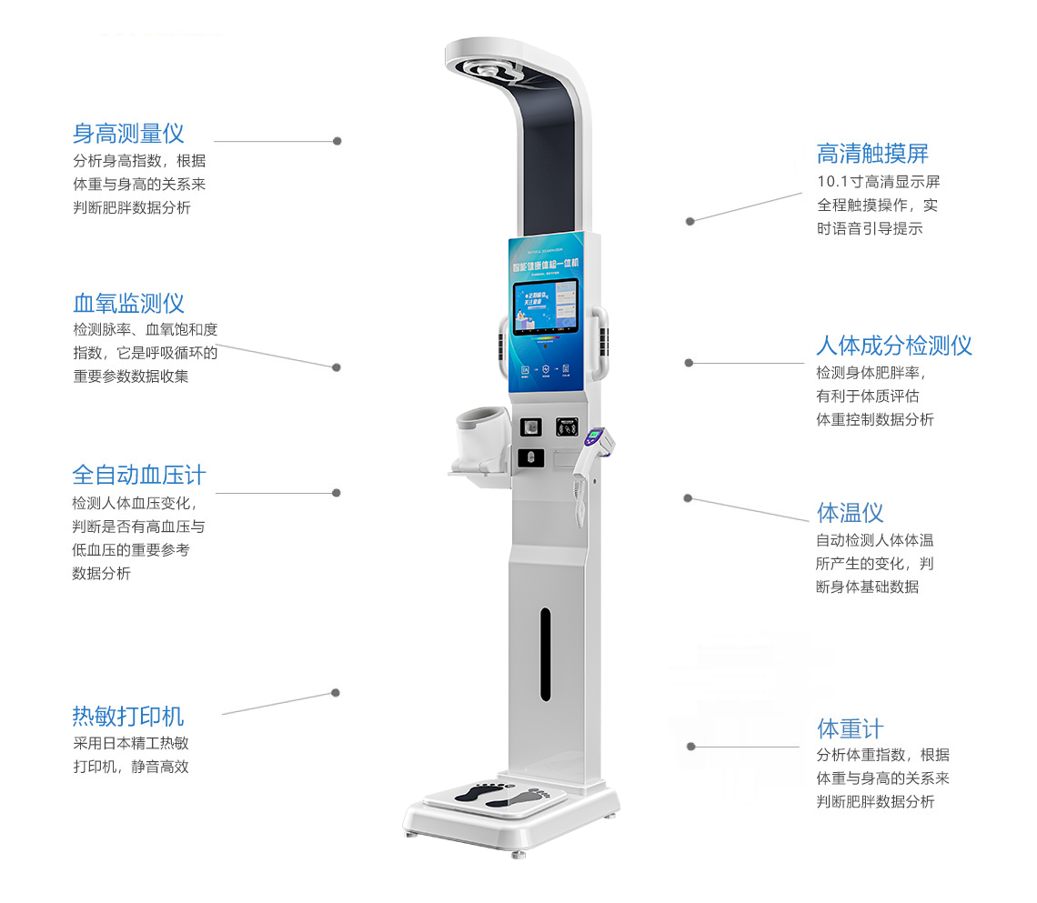 品牌名称:普瑞森 设备型号:PRS-600A 规格尺寸:80×62.2×238.7cm 屏幕尺寸:10.1寸主控屏 标配功能:身高、体重、BMI、体温、血压、脉率、人体脂肪、血氧、视力、中医。 拓展功能:血糖、尿酸、胆固醇、酒精。 登记方式:人脸识别、扫码、手工录入(可拓展:身份证识别、医保卡、医保码、IC/ID卡)。 应用配置:语音引导、触摸、打印。 技术配置:安卓系统、蓝牙、无线、有线(可拓展:4G)。 可对接:第三方平台对接、HIS、LIS、EMR、公卫平台、慢病平台、家医平台、API接口等。 -