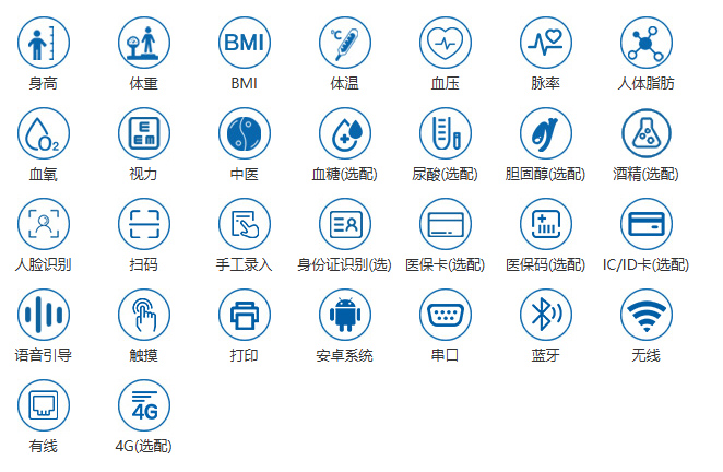 品牌名称:普瑞森 设备型号:PRS-660A 规格尺寸:62×48×235cm 屏幕尺寸:32寸主控屏 标配功能:身高、体重、BMI、体温、血压、脉率、人体脂肪、血氧、视力、中医。 拓展功能:血糖、尿酸、胆固醇、酒精。 登记方式:人脸识别、扫码、手工录入(可拓展:身份证识别、医保卡、医保码、IC/ID卡)。 应用配置:语音引导、触摸、打印。 技术配置:安卓系统、串口、蓝牙、无线、有线(可拓展:4G) 可对接:第三方平台对接、HIS、LIS、EMR、公卫平台、慢病平台、家医平台、API接口等。 -