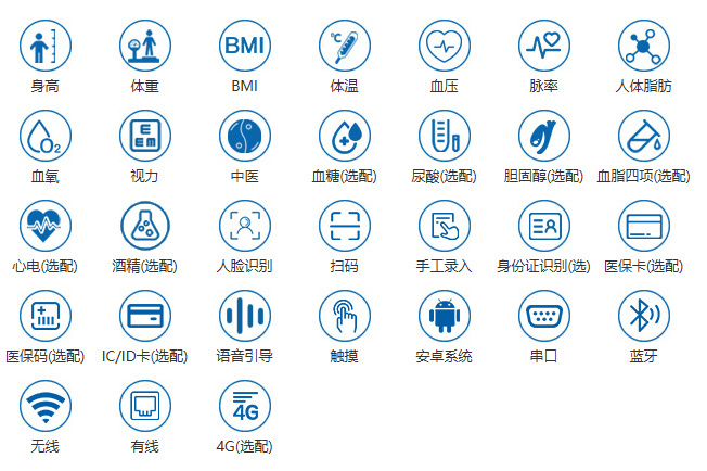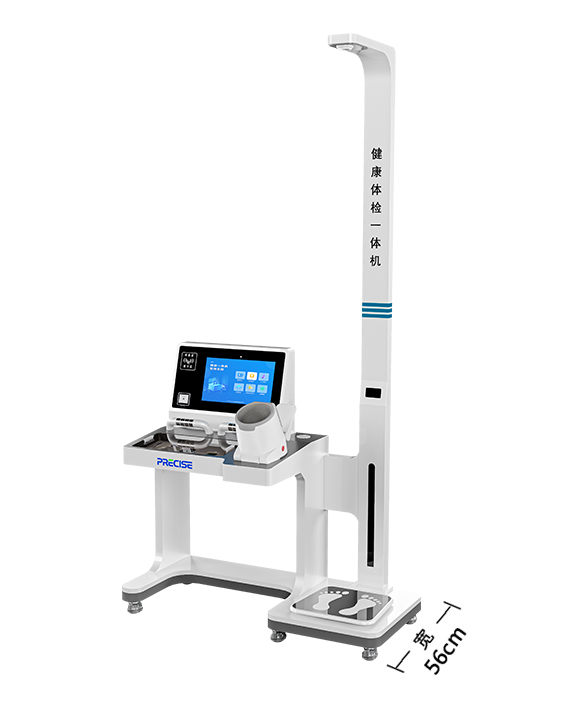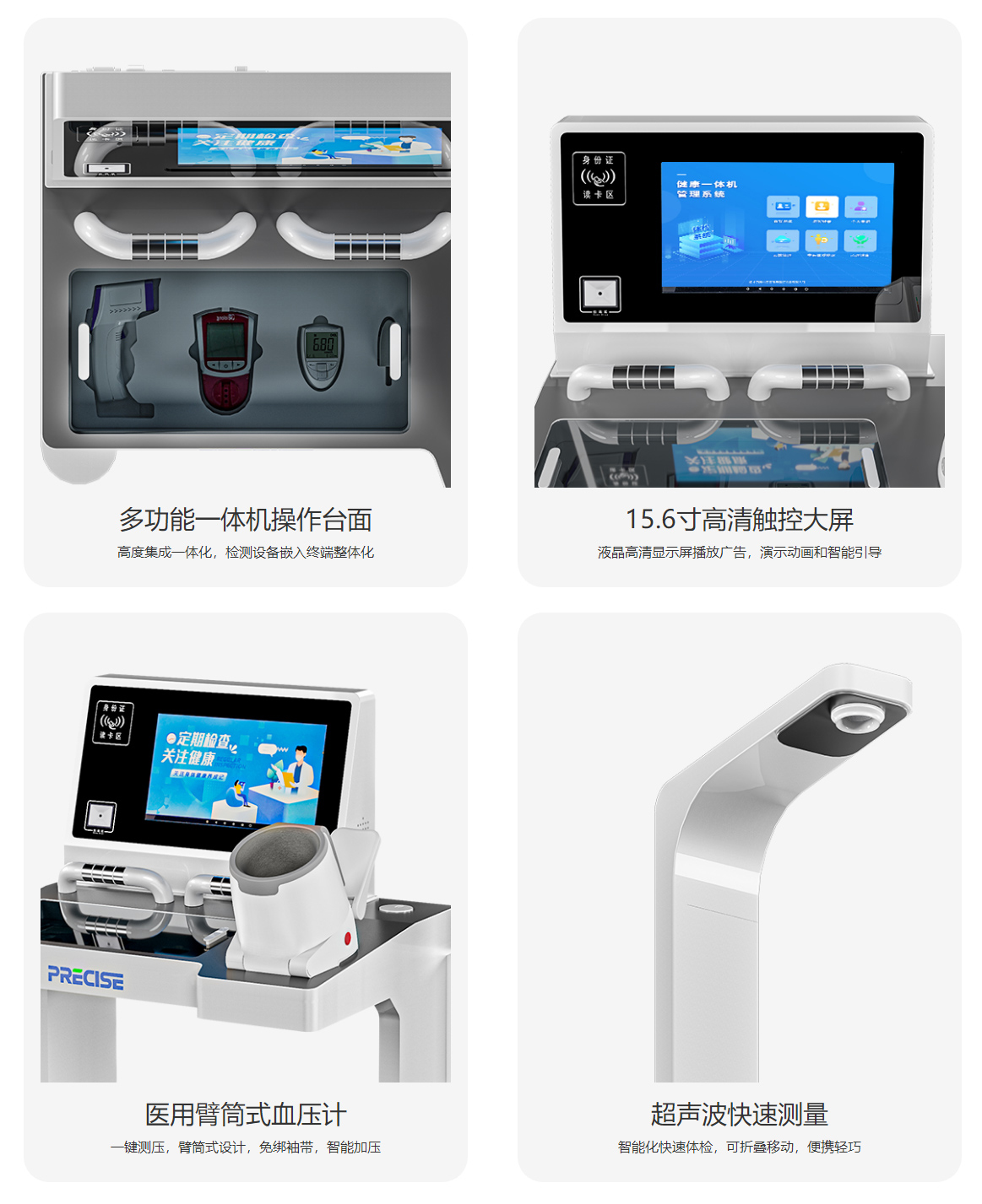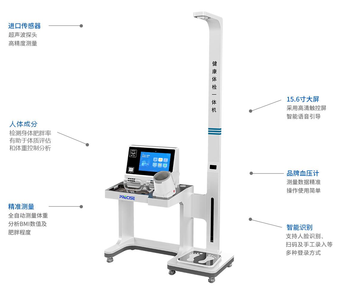 品牌名称:普瑞森 设备型号:PRS-900A 规格尺寸:120×56×240cm 屏幕尺寸:15.6寸主控屏 标配功能:身高、体重、BMI、体温、血压、脉率、人体脂肪、血氧、视力、中医。 拓展功能: 血糖、尿酸、胆固醇、血脂四项、心电、酒精。 登记方式:人脸识别、扫码、手工录入(可拓展:身份证识别、医保卡、医保码、IC/ID卡)。 应用配置:语音引导、触摸。 技术配置:安卓系统、串口、蓝牙、无线、有线(可拓展:4G)。 可对接:第三方平台对接、HIS、LIS、EMR、公卫平台、慢病平台、家医平台、API接口等。 适用场景