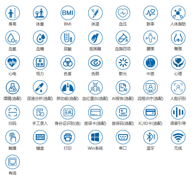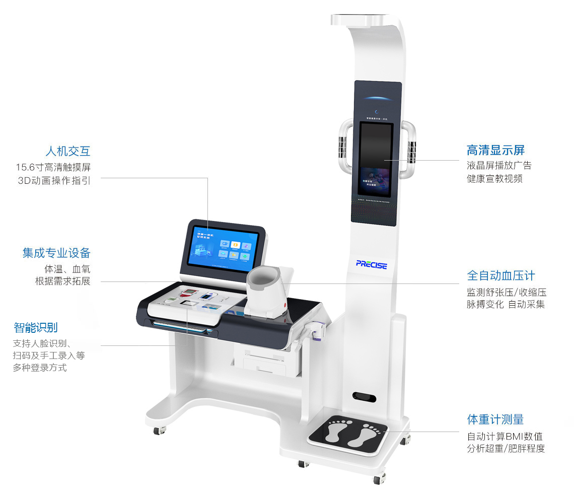 品牌名称:普瑞森 设备型号:PRS-X1 规格尺寸:128×60×240cm 屏幕尺寸:15.6寸主控屏、10.1寸多媒体屏 标配功能:身高、体重、BMI、体温、血压、脉率、人体脂肪、血氧、血糖、尿酸、胆固醇、血脂四项、腰围、臀围、心电、视力、色盲、色弱、散光、中医、心理。 拓展功能:酒精、尿液分析、肺功能、血红蛋白、AI报告、远程诊疗。 登记方式:人脸识别、扫码、手工录入(可拓展:身份证识别、医保卡、医保码、IC/ID卡)。 应用配置:语音引导、触摸、键盘、打印。 技术配置:Win系统、串口、蓝牙、无线、有线。 可对接:第三方平台对接、HIS、LIS、EMR、公卫平台、慢病平台、家医平台、API接口等。 适用场景