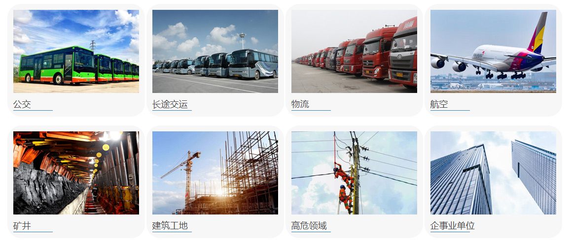 广泛应用于公交/长途交运/物流/航空/矿井/建筑工地/高危领域企事业单位等。
