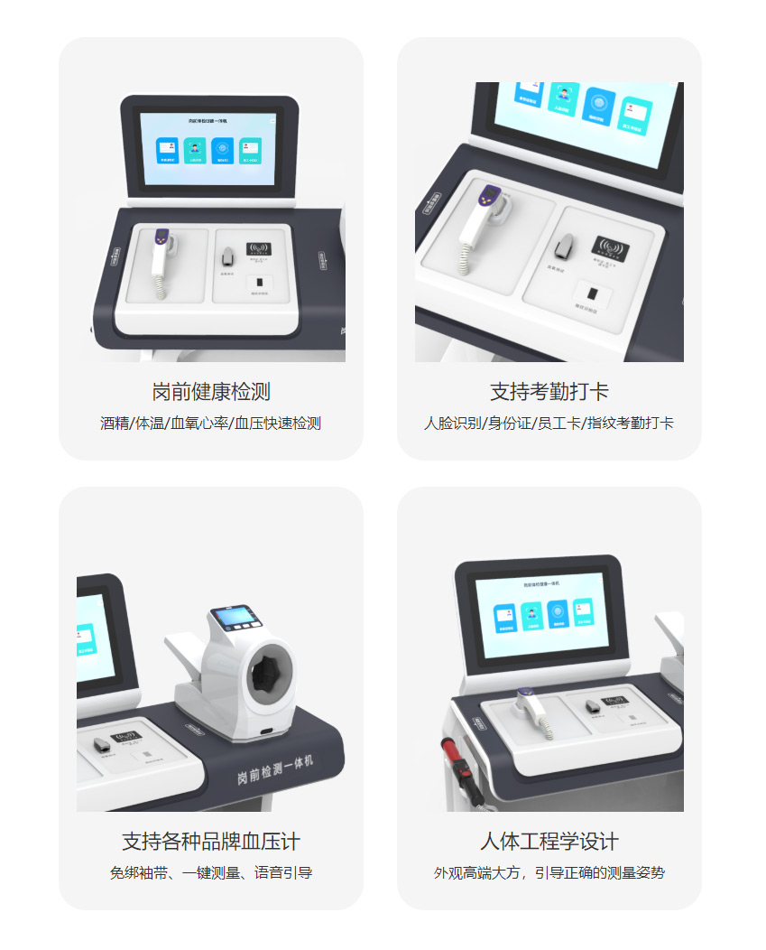 产品型号:PRS-X1C 尺寸:100*62*110cm多种登记方式:支持身份证/员工卡/指纹/人脸识别等 检测功能:身份识别、血压、心率、酒精、体温、血氧、指纹识别、考勤打卡 支持对接接口:慢病平台、健康管理平台、考勤系统等 适用场景